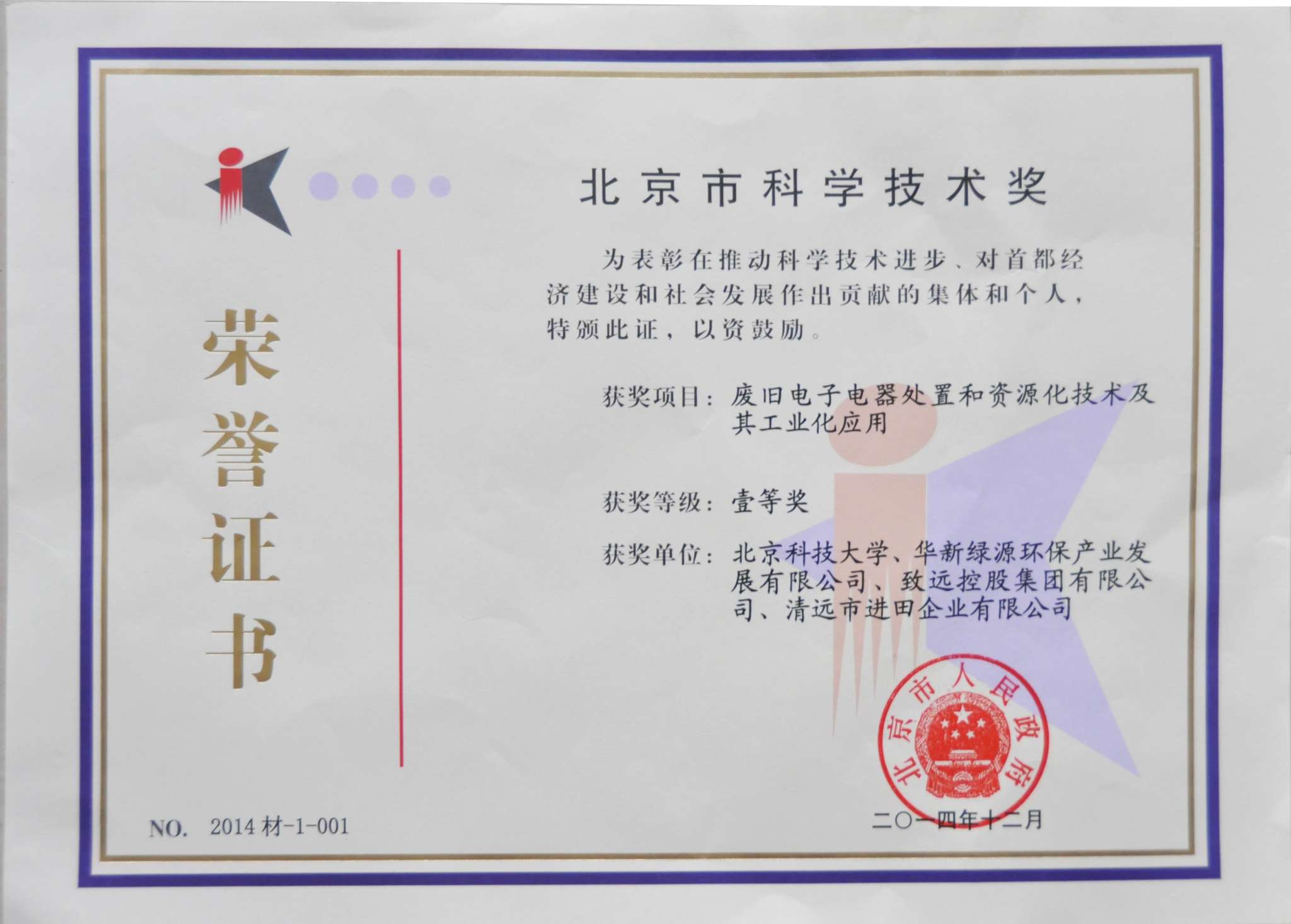 作為項目組成員,華新綠源環保產業發展有限公司研發的“廢舊電子電器處置和資源化技術及其工業化應用項目”榮獲北京市科學技術一等獎。